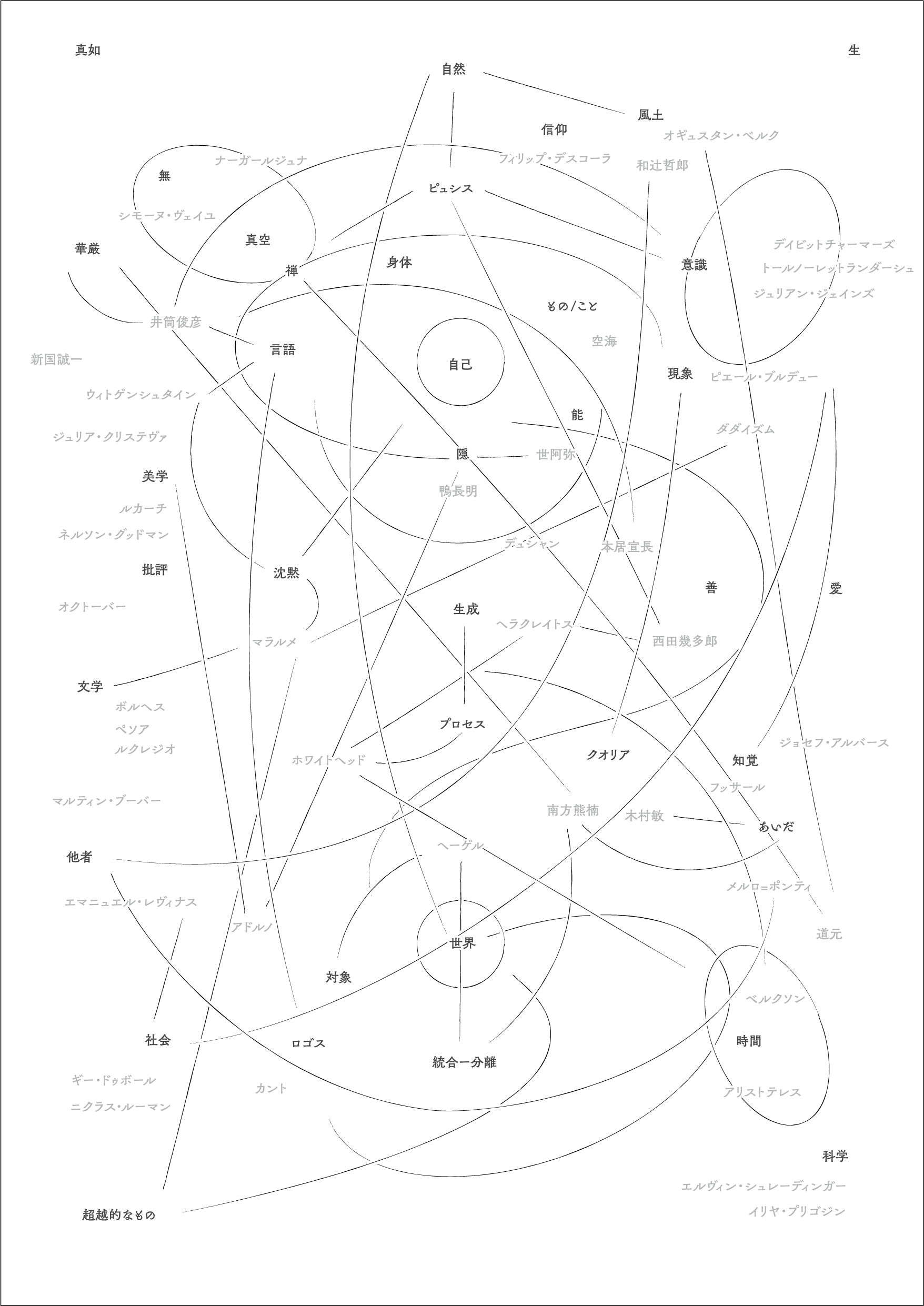 この地図は人間が生きる世界そのものを示すが、人間が人間であることの根拠は言語にあり、その言語の根拠は言語そのものにある。これは思考が言語に従属してしまう人間の知の本質であり、分解不可能な表現の基底でもある。