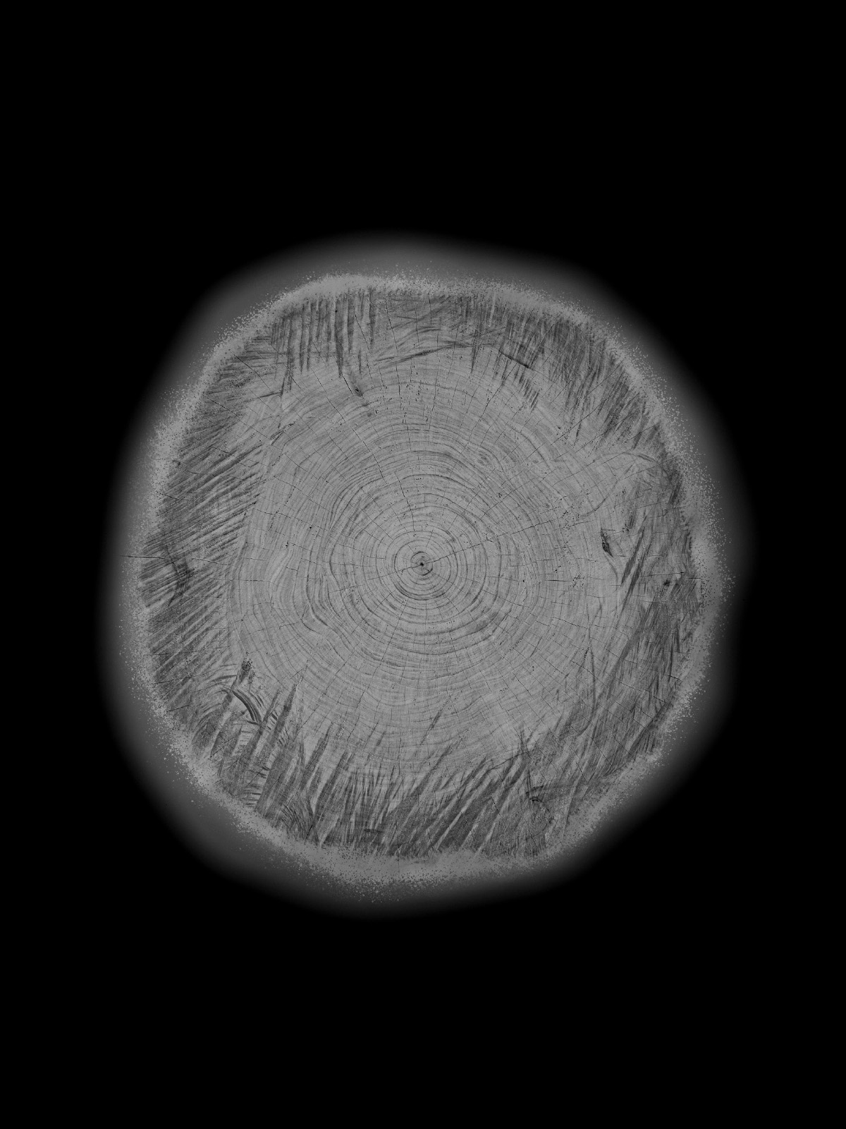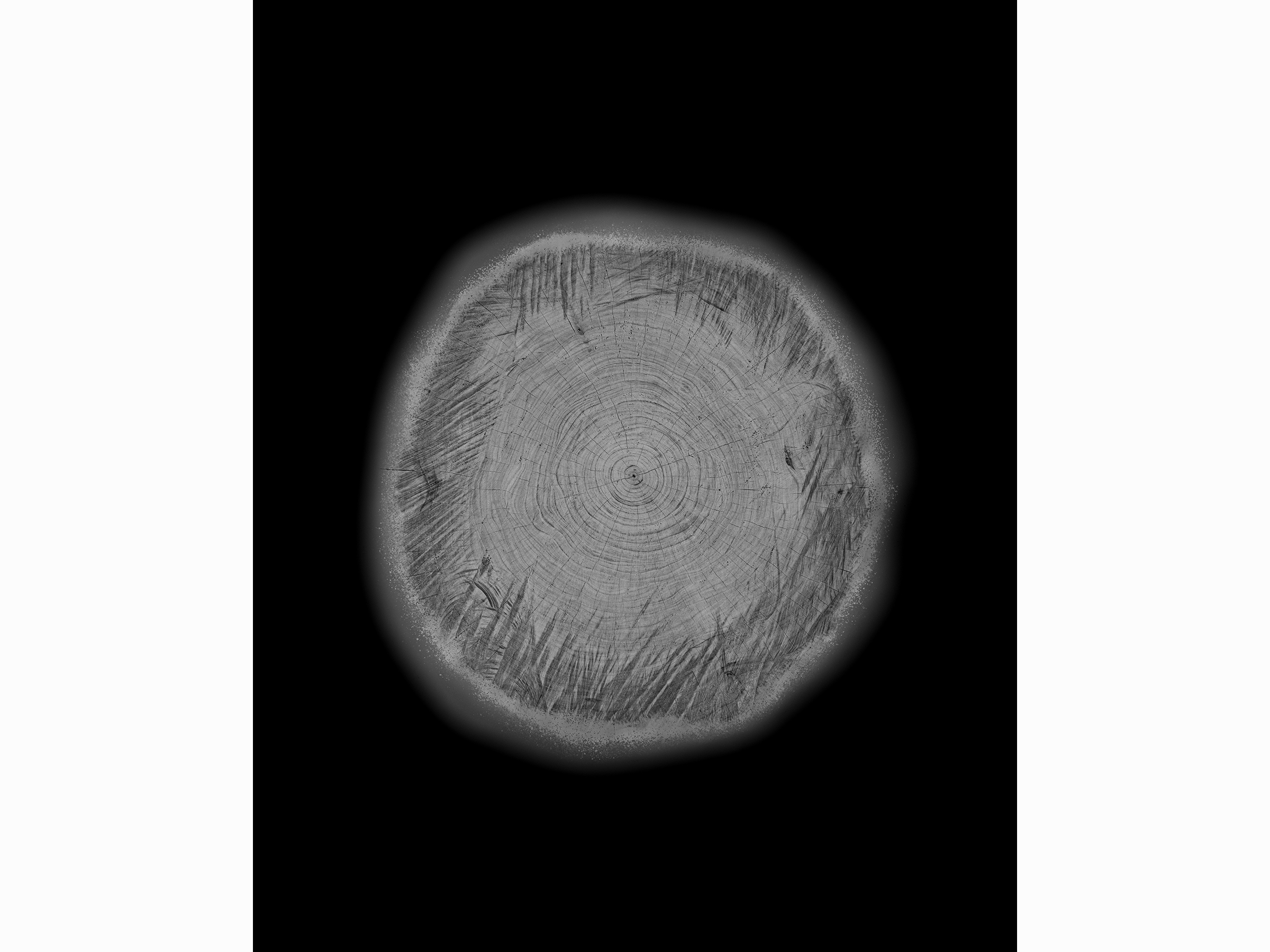 そこに定着されたイメージは木の年輪を写した写真である。これは木が積み重ねた経験を記録の形として、年輪の外縁に向けて物理的かつデジタル的に人為的に加工したものである。この像を二階調化し、プリントしたうえで消失したのが[1]だが、ここでは倫理的な主張――「木を伐採することの是非」は主題ではなく、むしろ価値の根拠そのものが相対化されている。