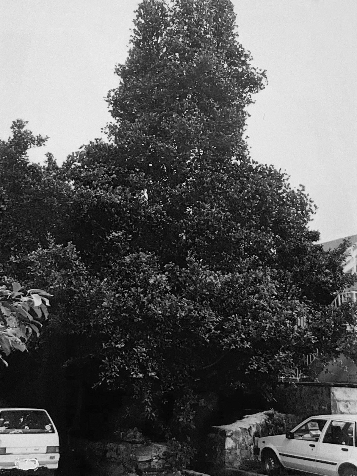 (左)切られた木が存在していた頃。ここには拝所があり、撮影時、平良市で最も高い木だったという。(右)同じ場所の現在。